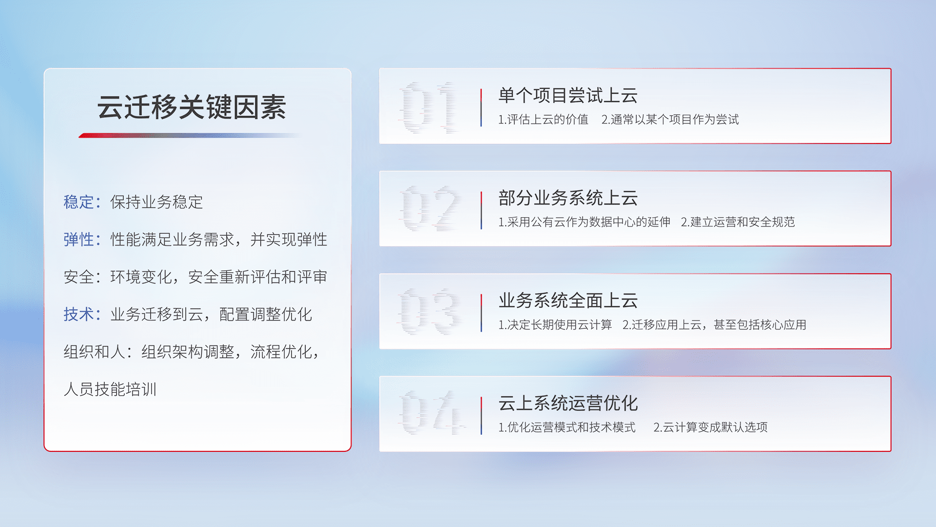 结合实际业务,,从规划设计、、云平台选型、、云原生改造、、、数据迁移、、、、集成交付,,,,迁移全过程为客户识别最佳上云路径,,做好风险识别管理,,,,设计网络架构、、、身份权限、、安全审计合规、、、操作审计、、、日志审计、、、、监控告警策略、、、、多站点容灾设计等,,,,对云上基础设施进行整体规划,,,提升IT治理水平,,以满足弹性、、高可用、、、高性能的需求。。